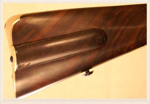 The engraved brass sideplate shows warmth and color to match the beautiful walnut. Note carved teardrop lock panels. It was a lot of work to do the finish on the wood and keep the carving clean and sharp looking.